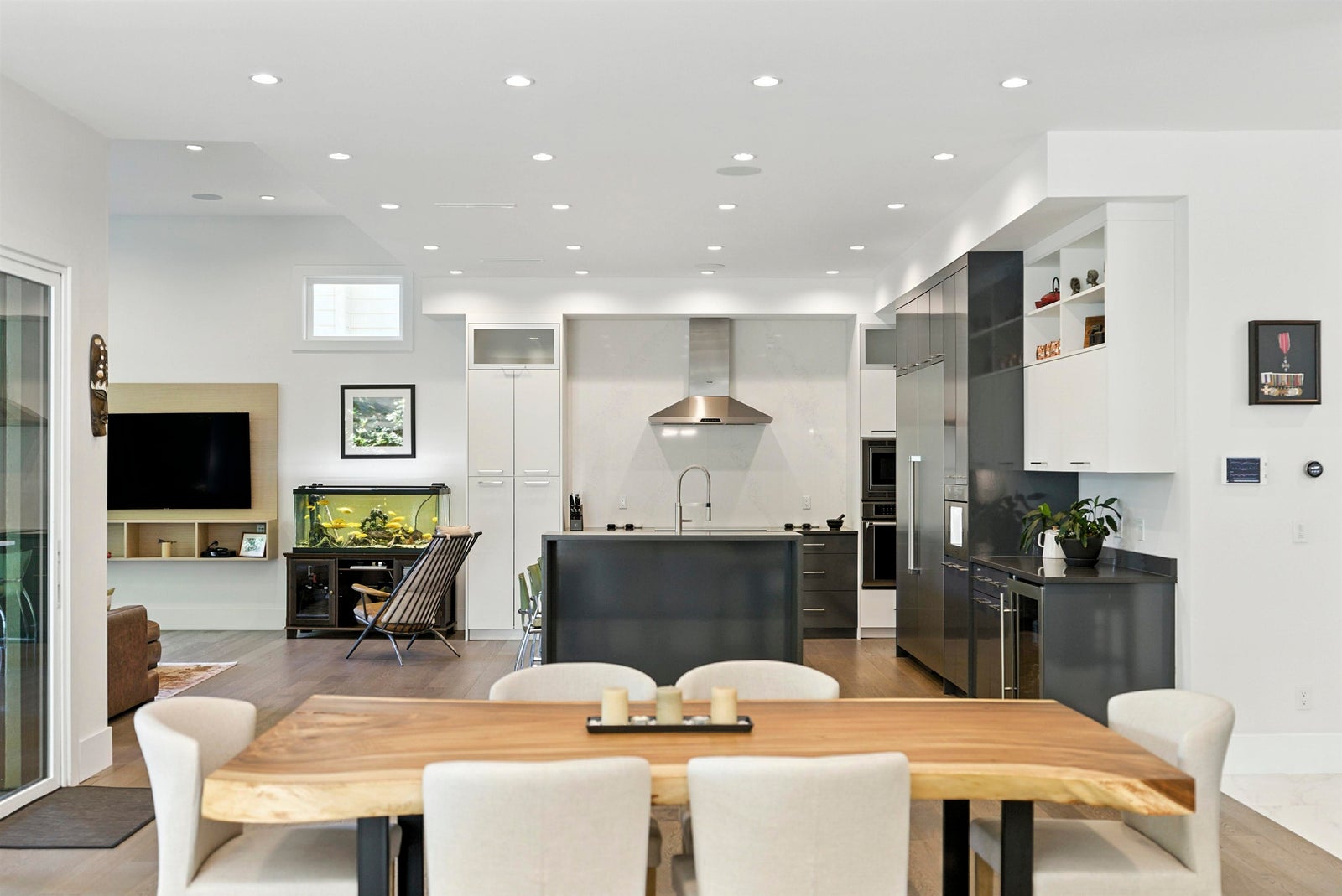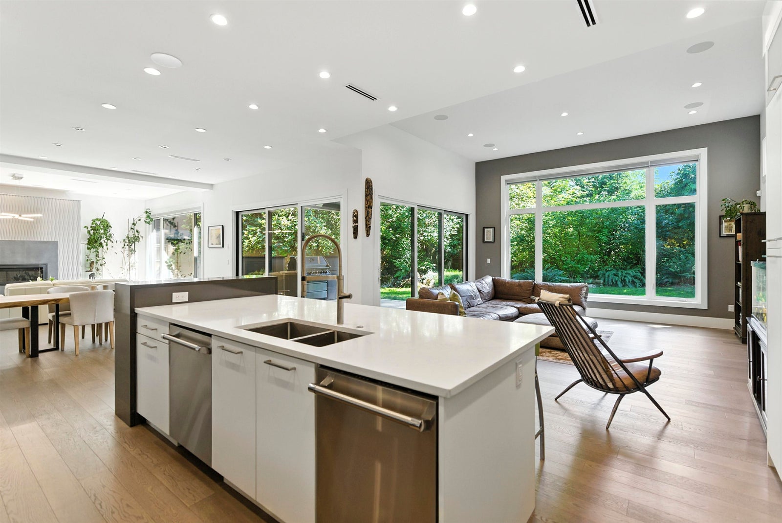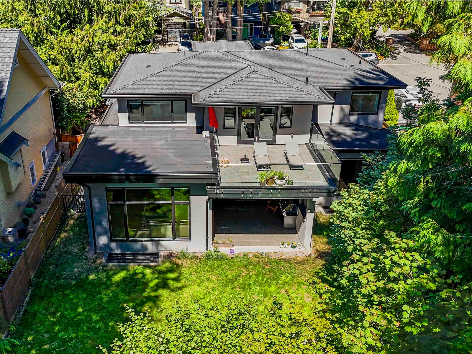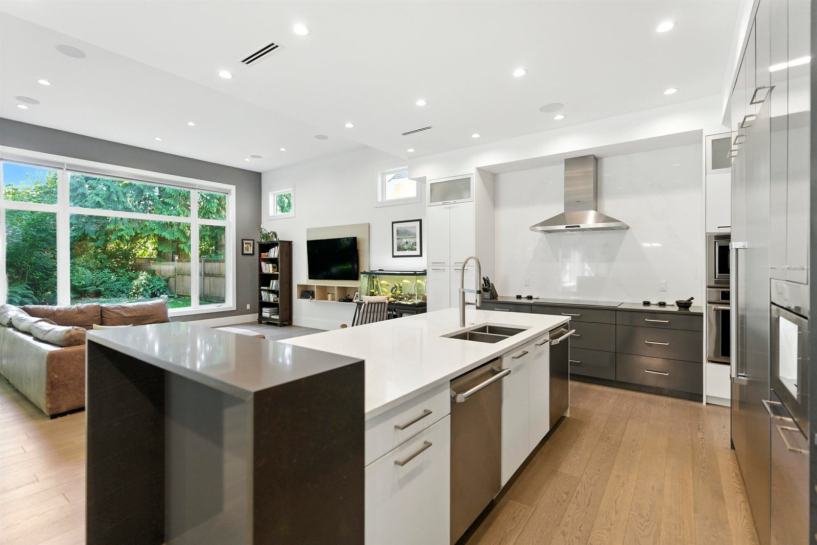 This incredible 4,918 sq ft modern masterpiece offers an exceptional floor plan & timeless design on a quiet cul-de-sac. The main level is built for entertaining, with soaring over height ceilings, open-concept living/dining/family room & a stunning kitchen feat commercial grade fridge/freezer, induction, 2 DW, coffee maker & massive island. Wok kitchen has a gas range, connects to laundry/mud-room & the attached 2 car garage. Upstairs features 4 spacious bedrooms, including a serene primary suite. The lower level includes a large rec room, full bar, 5th bedroom & steam shower for the main home, plus a legal 2-bdrm suite w/ private side entry—ideal for extended family or rental income. Flat, private, fully fenced back yard. Steps to Lynn Canyon, top-rated schools & Lynn Valley Centre.