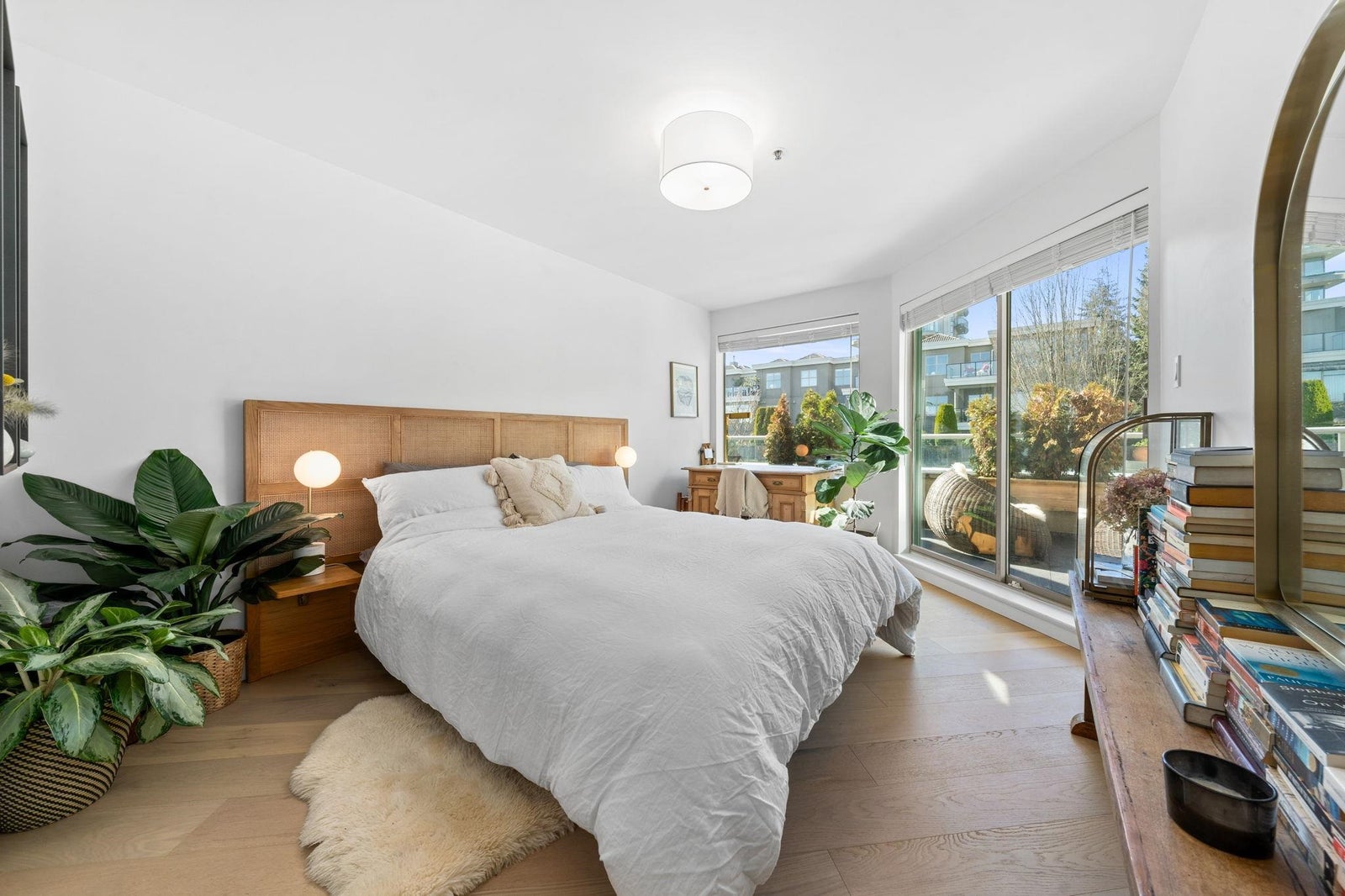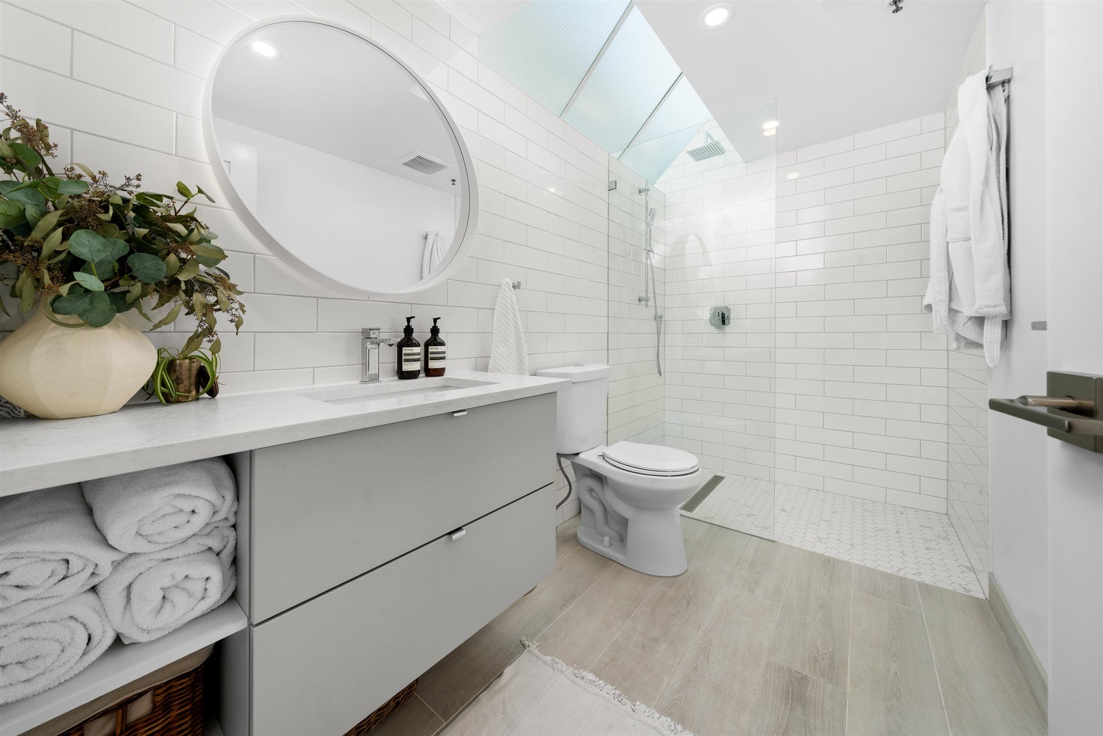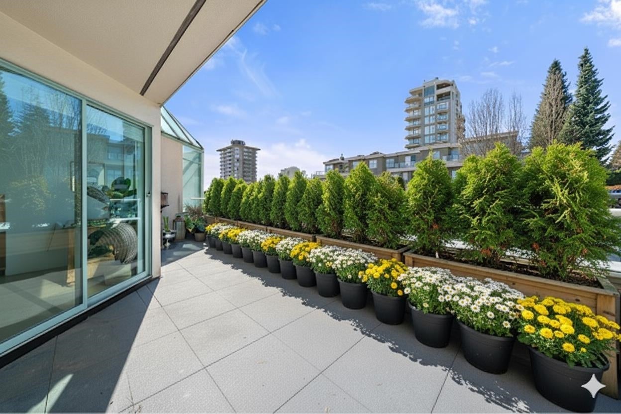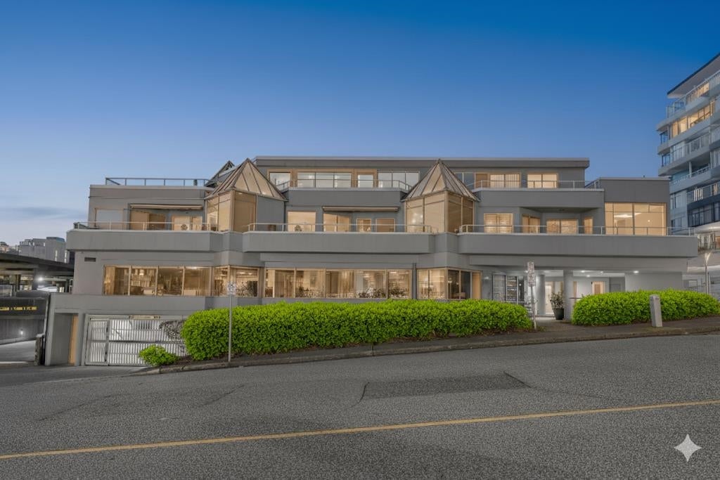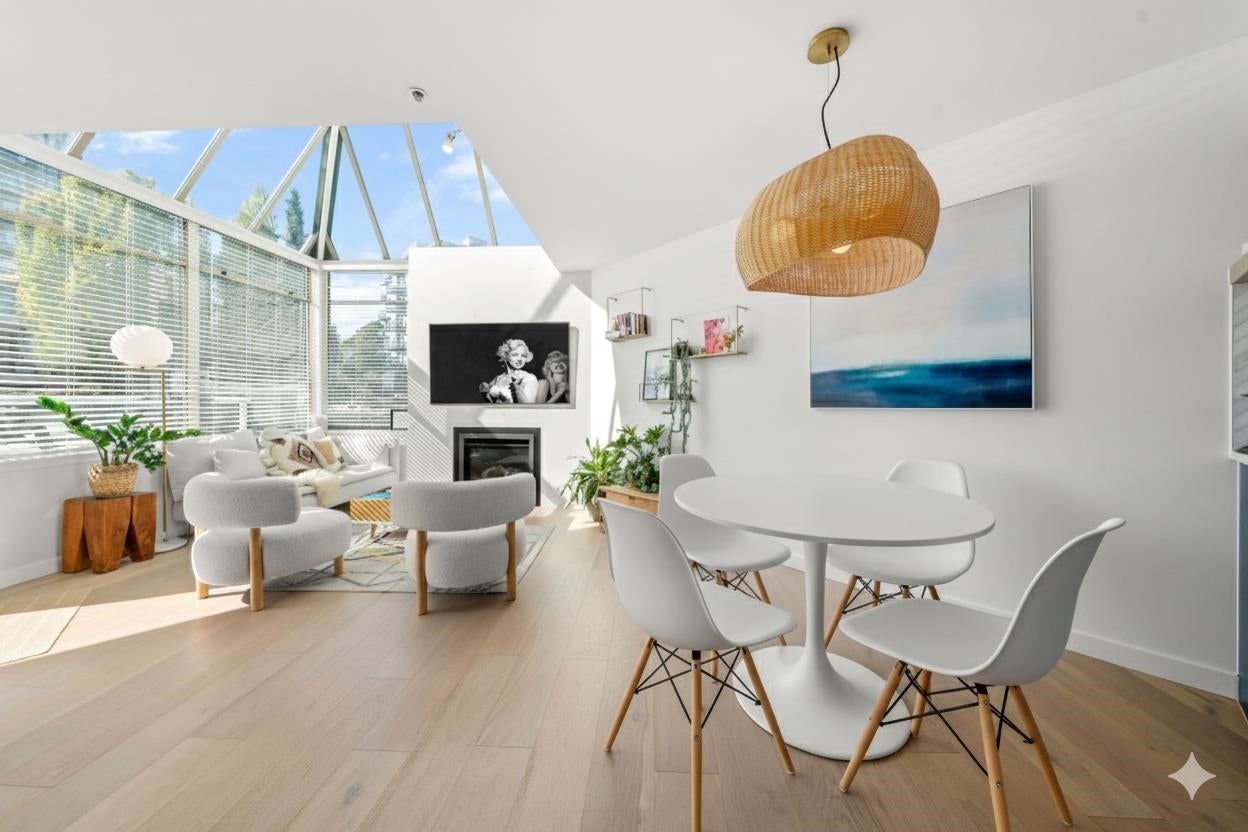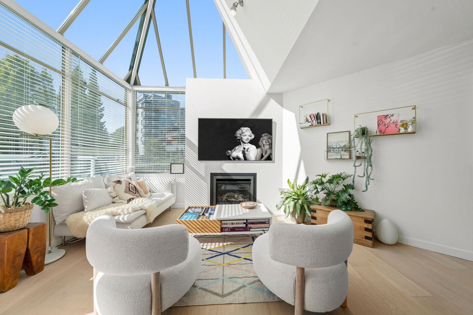 Steps from the oceanfront and all the best of Ambleside in this stunning, SW-facing FRESH & BRIGHT corner unit impressing even the most discerning with lofty vaulted ceilings and generous skylights. Thoughtfully renovated, the attention to detail throughout creates a warm and inviting aesthetic: from the angled hardwood flooring, to the designer kitchen and spa-like bathrooms. The spacious primary offers patio access, walk-in closet with custom built-ins and serene ensuite bath with deep soaker tub and recessed lighting. Enjoy an XL, west-facing, 200+ sq ft private patio with updated modern pavers for summer entertaining. Features include a cozy gas fireplace, in-suite laundry, 2 side-by-side parking spots with hose access and an XL storage locker. OPEN HOUSE SAT SEPT 27TH 2-4pm