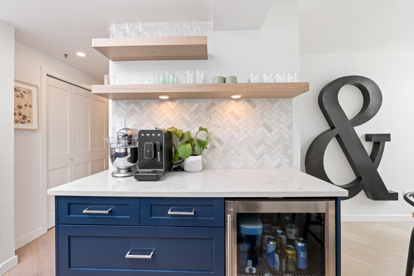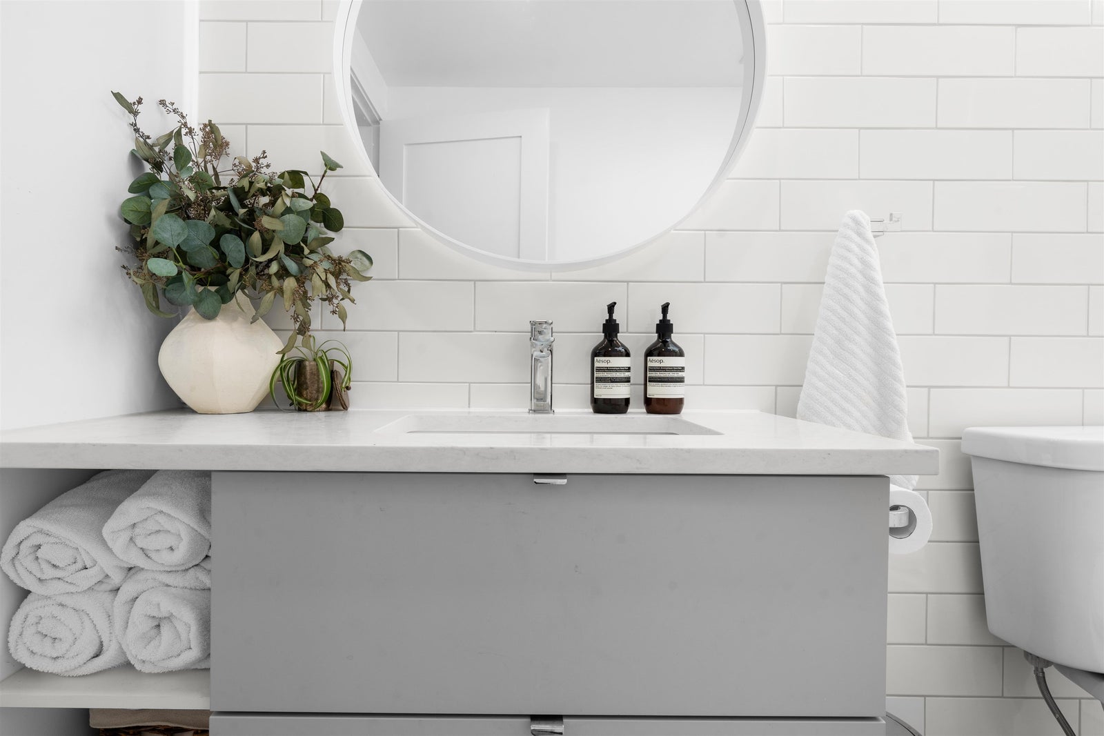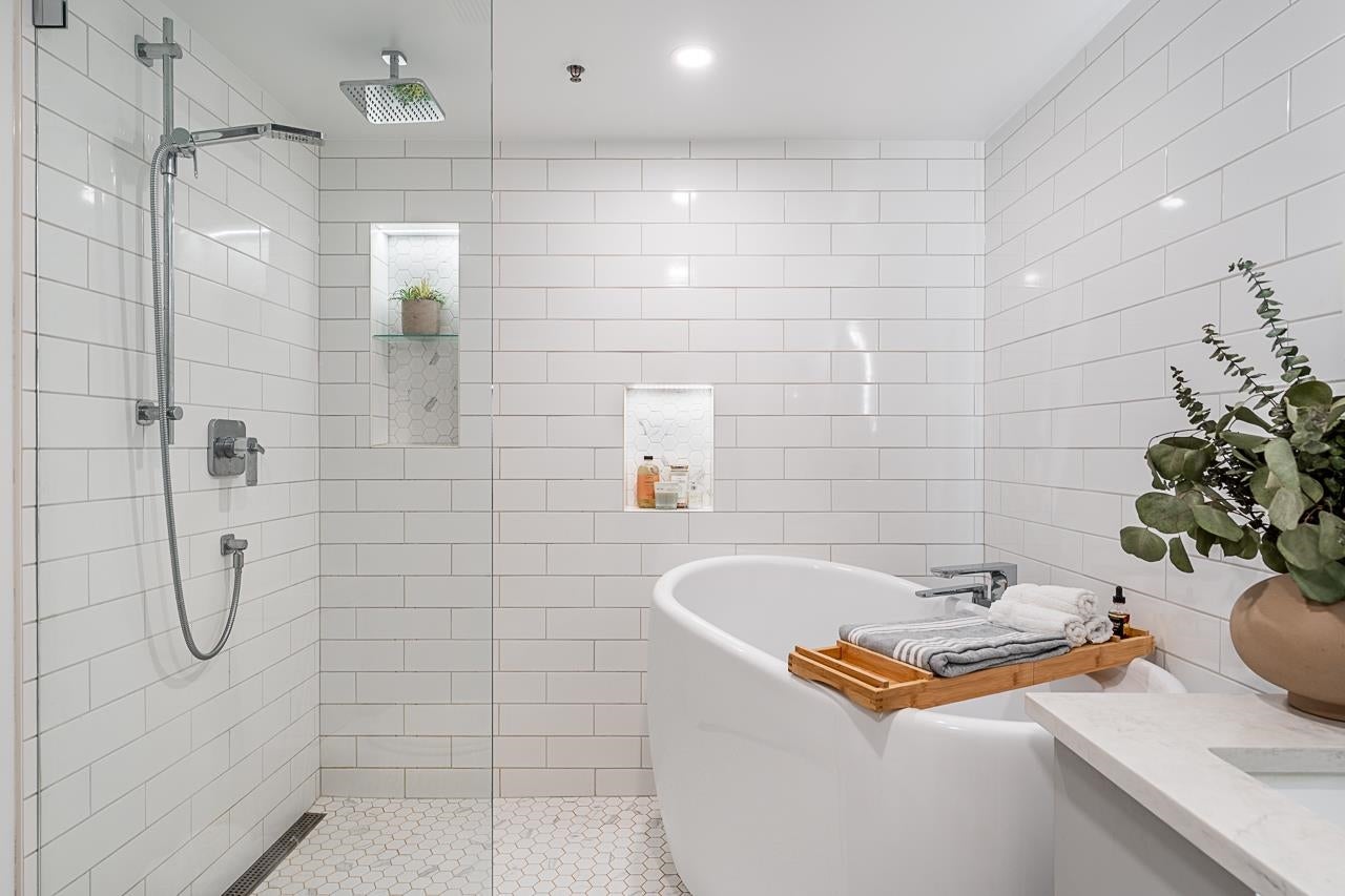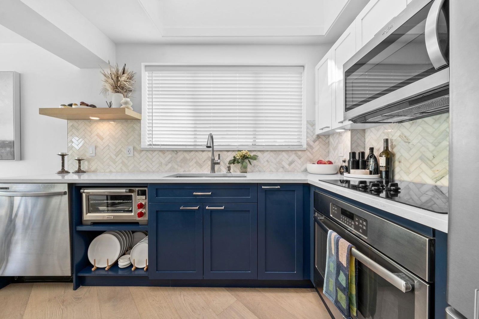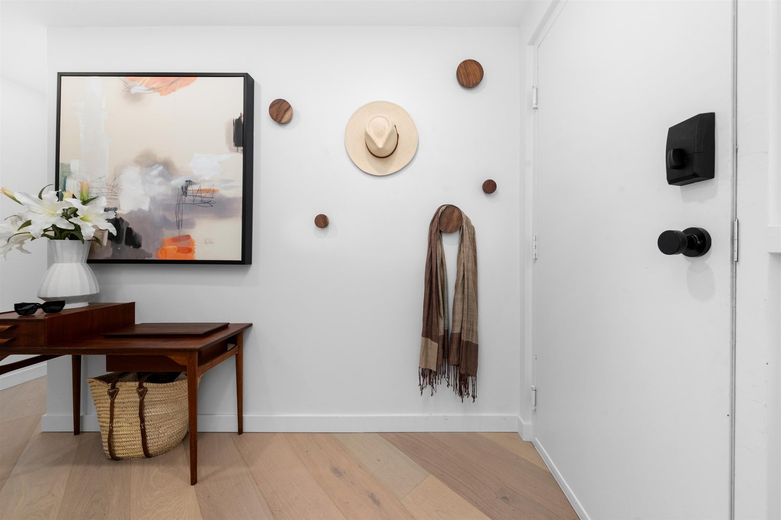 Steps from the oceanfront and all the best of Ambleside in this stunning, SW-facing FRESH & BRIGHT corner unit impressing even the most discerning with lofty vaulted ceilings and generous skylights. Thoughtfully renovated, the attention to detail throughout creates a warm and inviting aesthetic: from the angled hardwood flooring, to the designer kitchen and spa-like bathrooms. The spacious primary offers patio access, walk-in closet with custom built-ins and serene ensuite bath with deep soaker tub and recessed lighting. Enjoy an XL, west-facing, 200+ sq ft private patio with updated modern pavers for summer entertaining. Features include a cozy gas fireplace, in-suite laundry, 2 side-by-side parking spots with hose access and an XL storage locker. OPEN HOUSE SAT SEPT 27TH 2-4pm