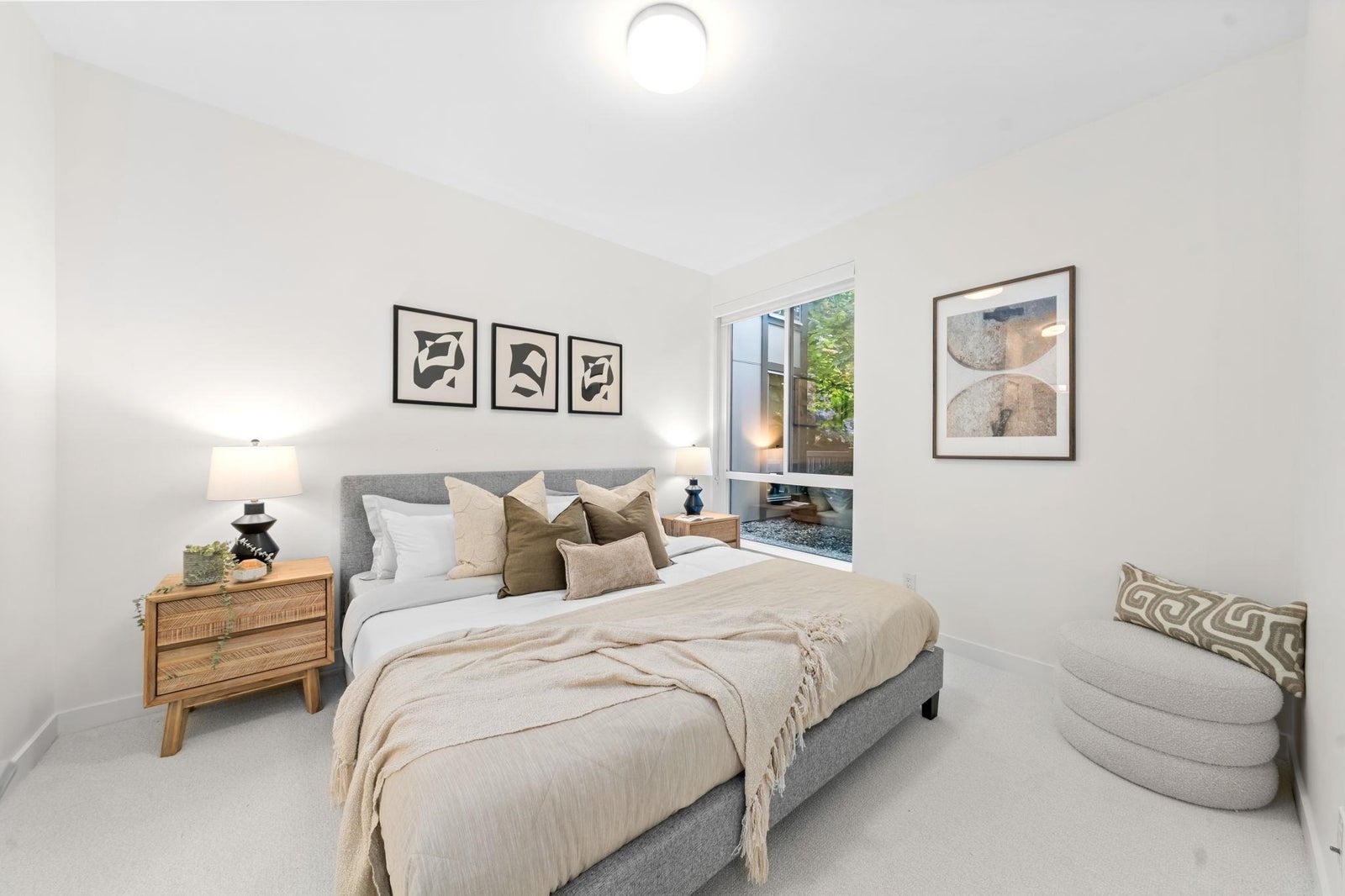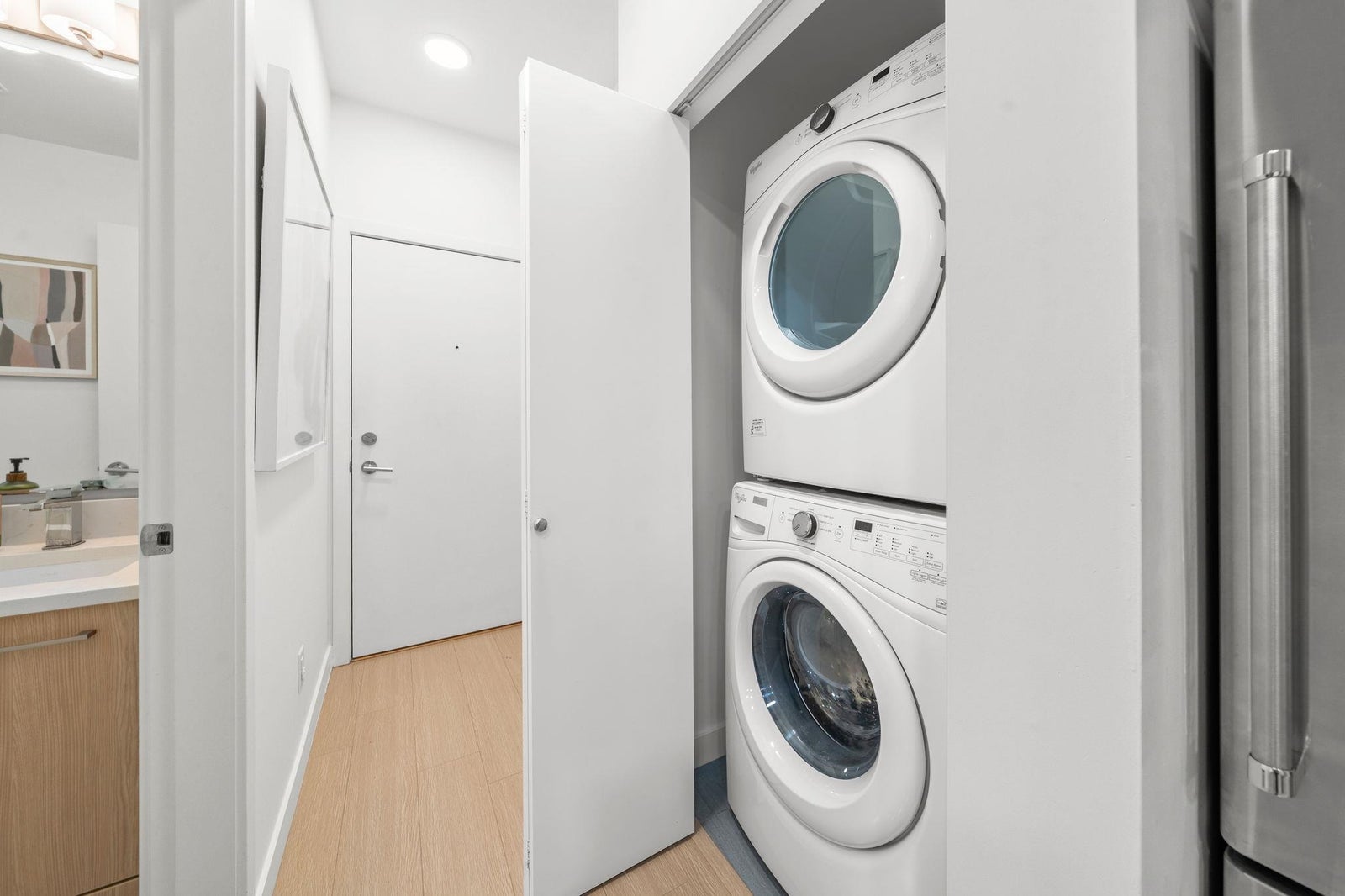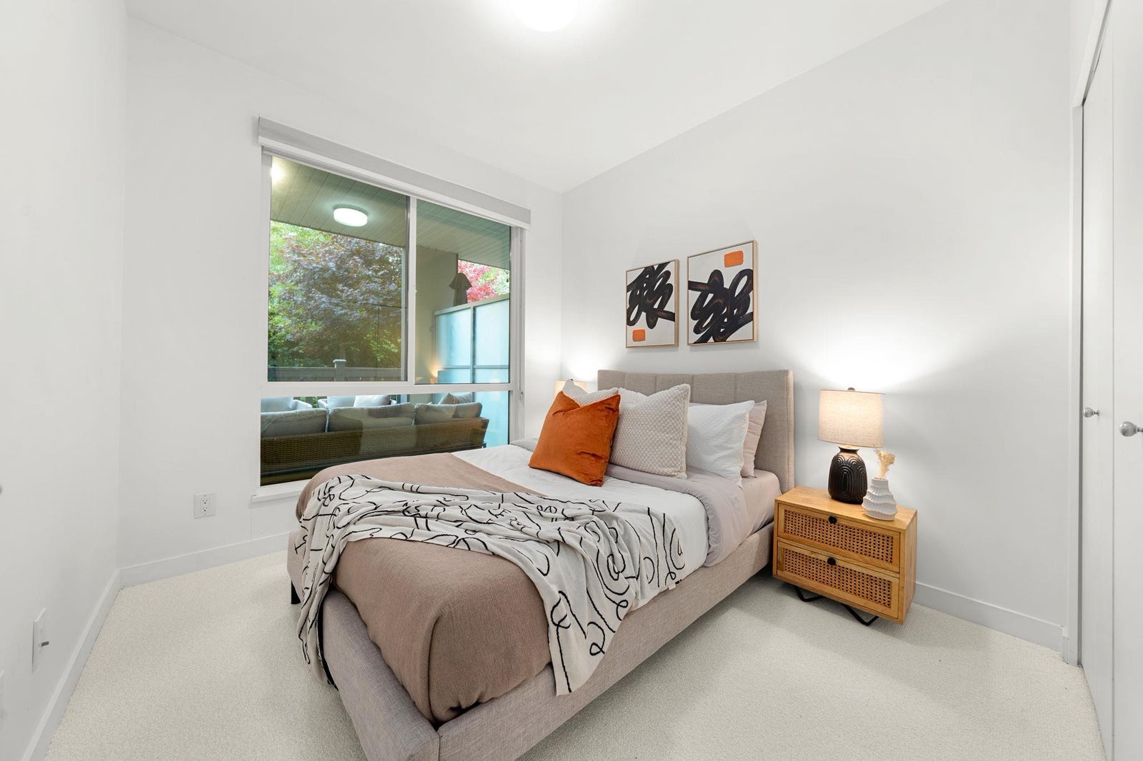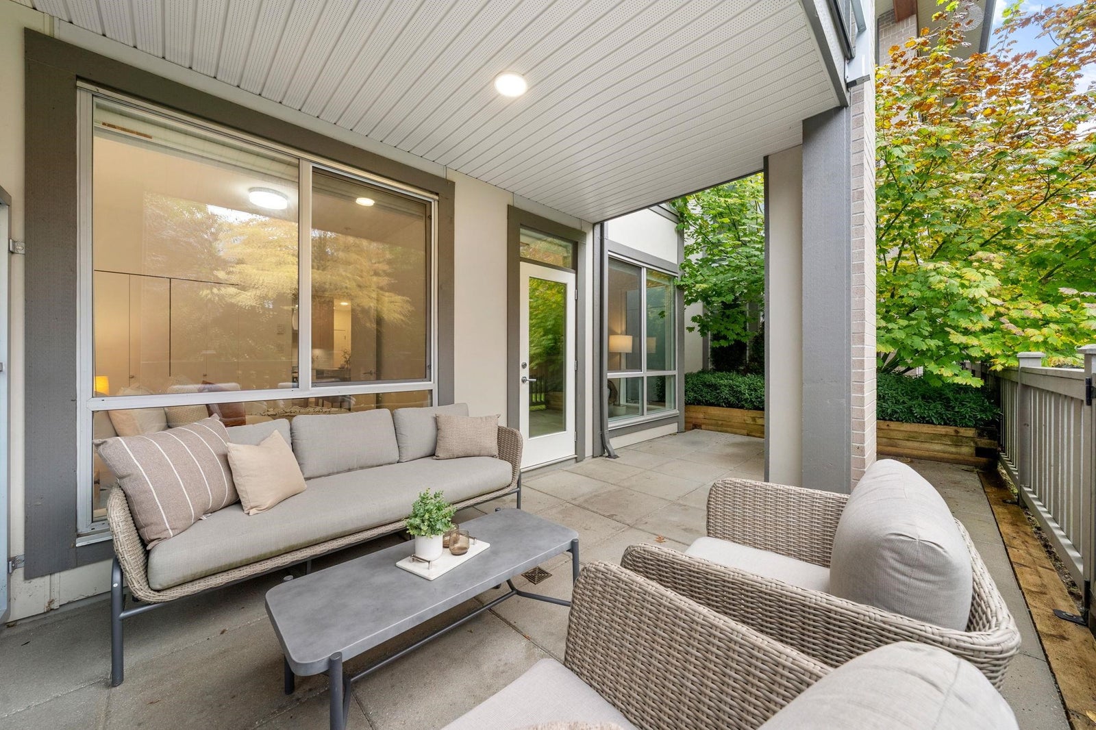 Discover modern living at Seasons by Ledingham McAllister. This exquisite two-bedroom, two-bathroom home, in near-new condition, is a quiet sanctuary tucked away on the building's most peaceful side. The open-concept floor plan seamlessly connects to an expansive, private, and gated covered patio—an ideal extension of your living space. The chef-inspired kitchen boasts sophisticated soft-closing white oak cabinets, elegant quartz countertops, and a premium stainless steel KitchenAid appliance suite. Situated in the heart of the dynamic Brentwood area, this home is a quick five-minute walk to the SkyTrain station, placing you at the centre of convenience. Amenities include a state-of-the-art exercise centre and a dedicated children's play area. **OPEN HOUSE OCTOBER 25TH 2-4pm.**