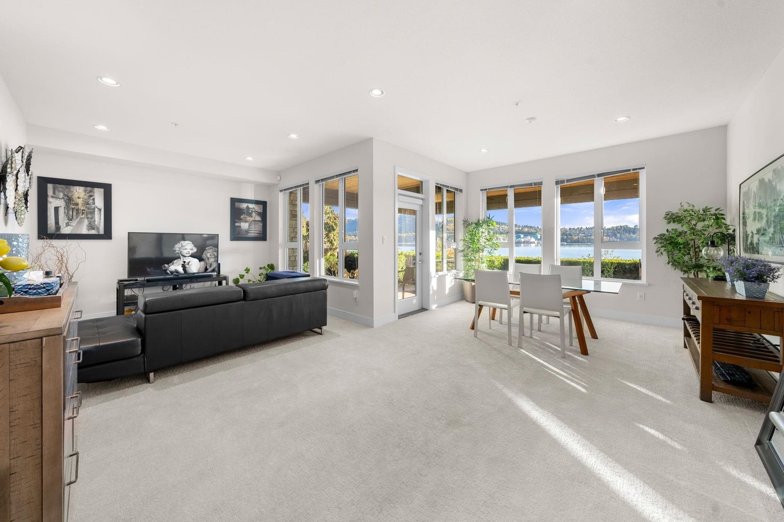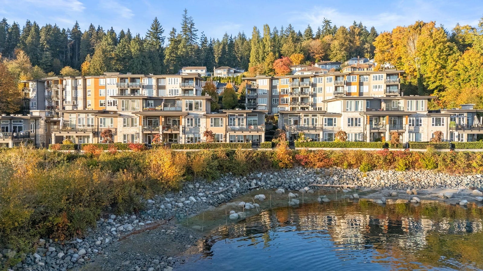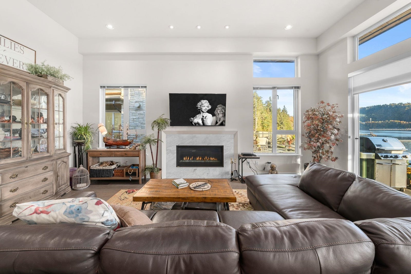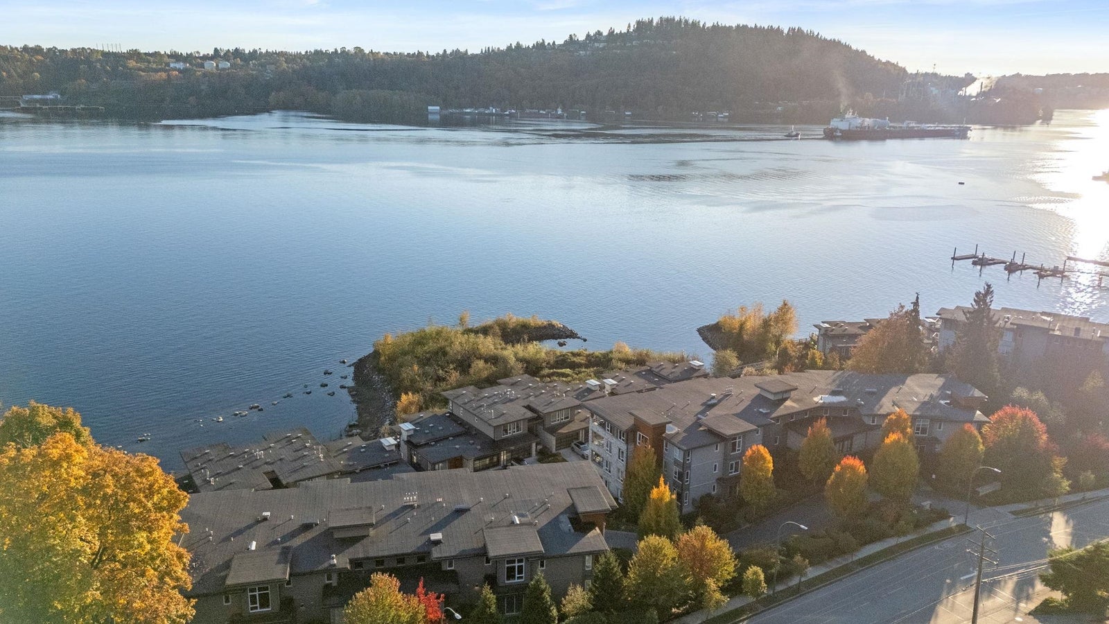 WATERFRONT LUXURY AT CATES LANDING. Experience the ultimate in North Shore waterfront living in this rarely available two-level 2,942 sqft townhome designed by renowned Keith Hemphill of RHA. Open-concept main w/ Bosch kitchen, stone counters, marble splash, 11’ ceilings, entertainment island + French doors seamlessly integrating oversized view deck. Large office, powder with limestone floor, 2-car garage + primary suite with panoramic views, spa-inspired 5-pc ensuite, and walk-in closet. Two more beds + 2 baths down, ample storage, full sized side-by-side laundry + large family room opening to private fenced yard w/ direct waterfront access. Radiant in-floor heating, gas fireplace, hardwood flrs and plush carpeting. Step onto the waterfront trail linking directly to Cates Park/Deep Cove.